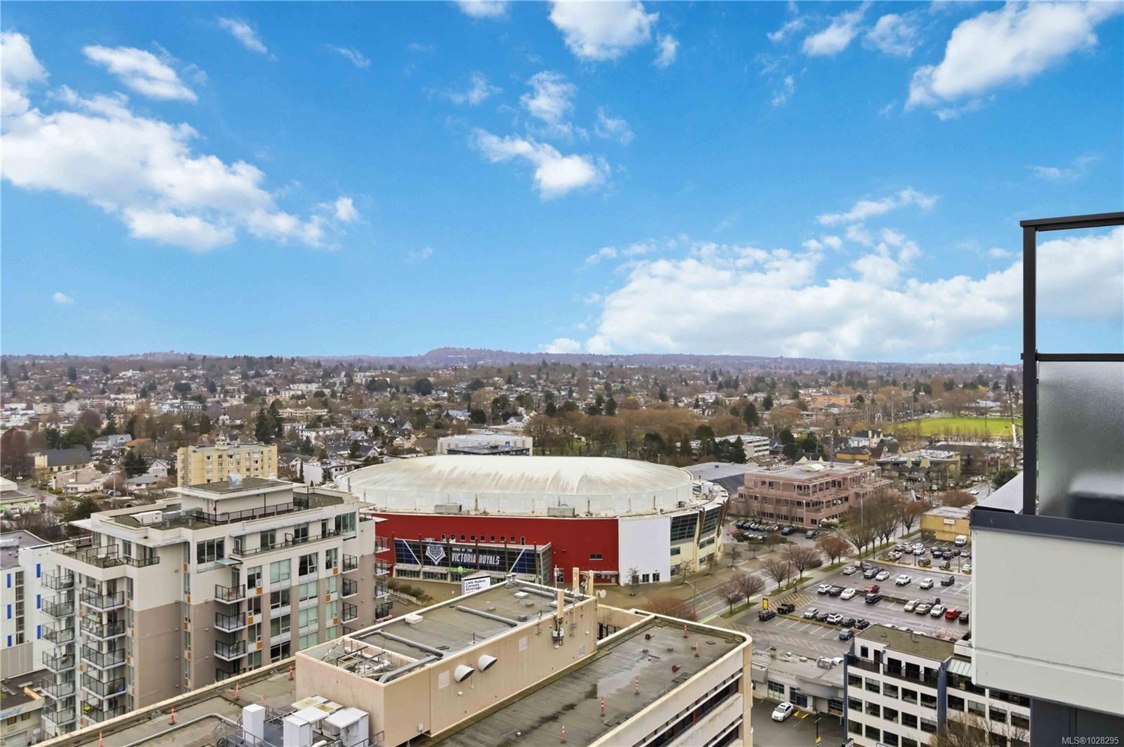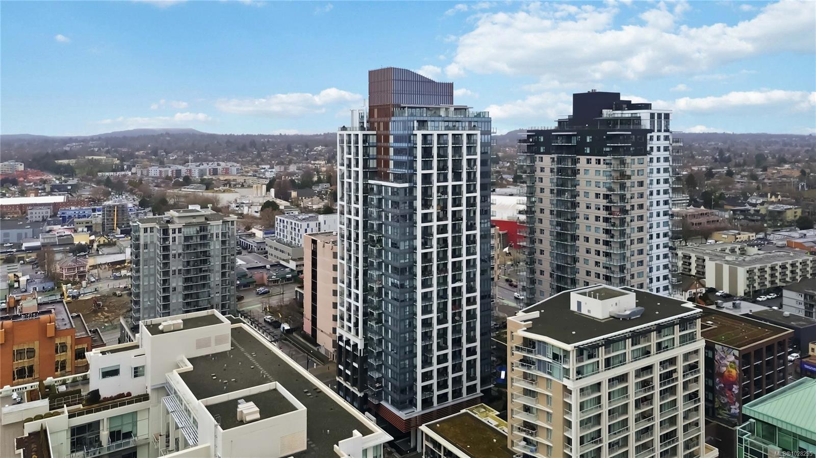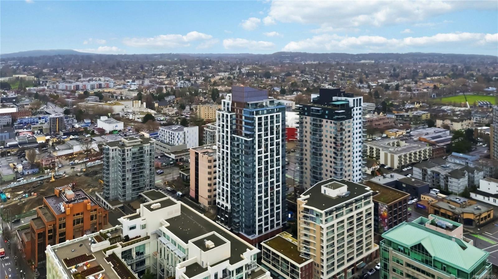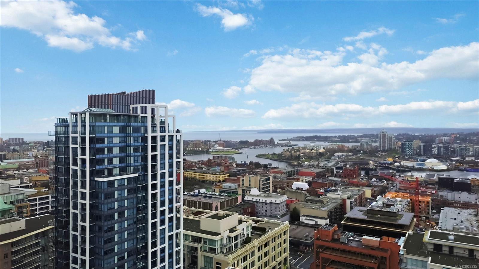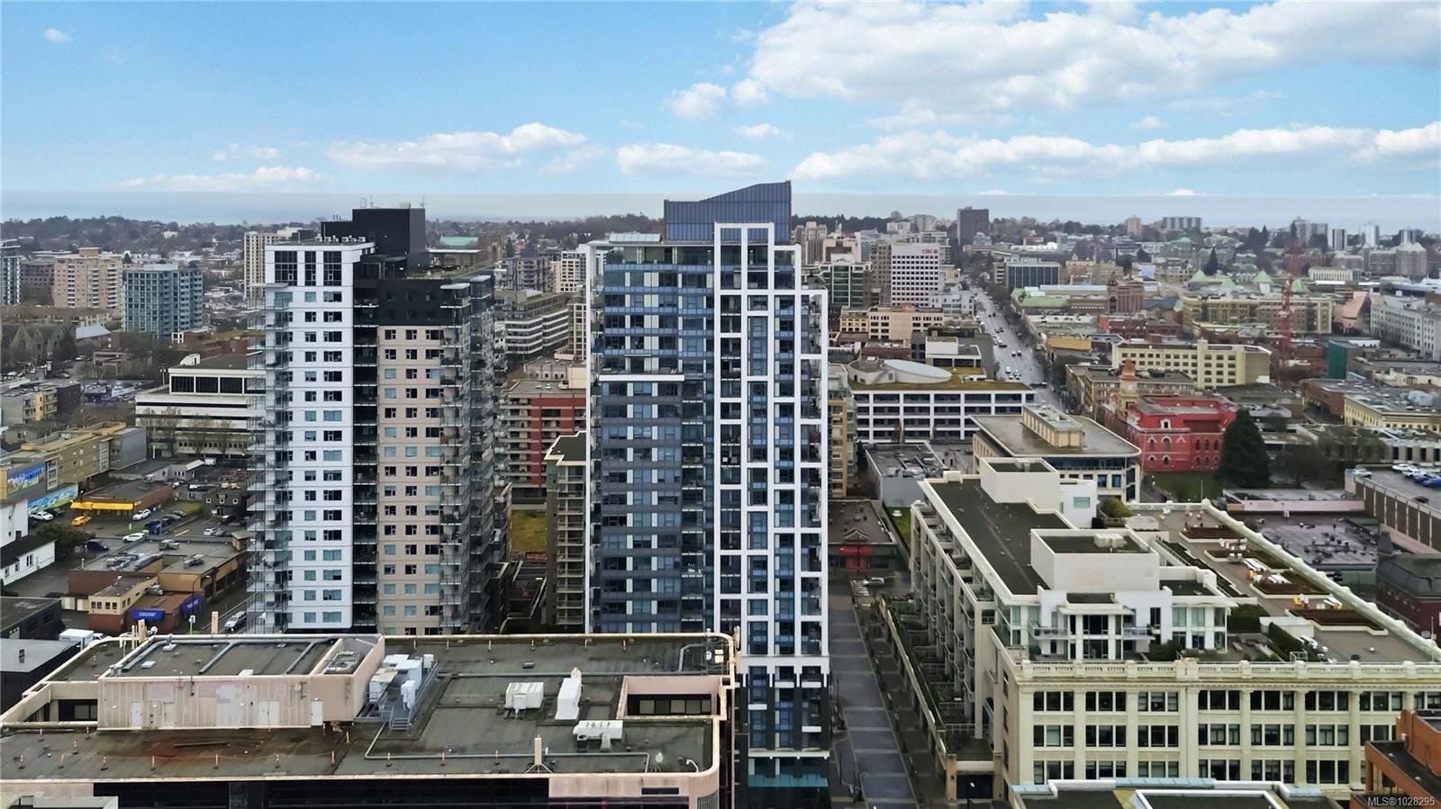 Welcome to the Executive 21st Floor at 777 Herald Street, where water, city, and mountain views create an exceptional downtown living experience. This executive two-bedroom, two-bathroom residence offers the rare bonus of two side-by-side secure underground parking stalls, a highly sought-after feature in the city. The thoughtfully designed open-concept layout is both stylish and functional, ideal for everyday living and entertaining. The modern kitchen features a spacious island with quartz countertops, built-in appliances, and sleek cabinetry, flowing seamlessly into the bright living room. Expansive floor-to-ceiling windows fill the home with natural light while showcasing the stunning surrounding views. This home includes several custom upgrades, including built-in closet organizers, a dedicated built-in desk/workspace, and stylish deck flooring that enhances the outdoor living area. Custom designed Restoration Hardware Cloud couch and matching linen chairs are available for purchase, offering a convenient turnkey opportunity. Residents enjoy access to an impressive range of amenities designed to complement urban living. These include a full time concierge, fully equipped fitness centre, yoga studio, sauna, business centre, hobby room, and a spacious resident lounge with a full kitchen, perfect for hosting gatherings. The landscaped outdoor terrace features BBQs, a large dining table, children’s play area, and cozy outdoor fire pits. A private guest suite is also available, providing comfortable accommodation for visiting family and friends. The location is unbeatable. With a grocery store just steps away and the vibrant downtown core at your doorstep, you are within easy walking distance to the Inner Harbour, cafés, restaurants, shops, and countless amenities that make downtown Victoria such a desirable place to live. This is executive downtown living at its finest, stunning views, thoughtful upgrades, outstanding amenities, and an unbeatable location.