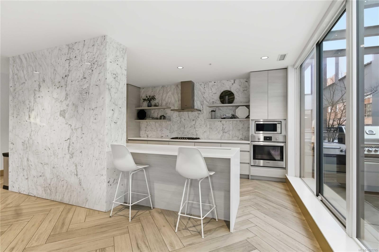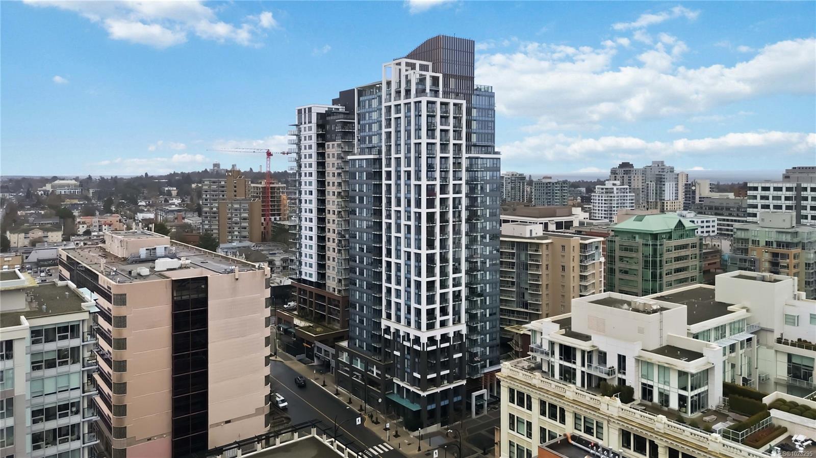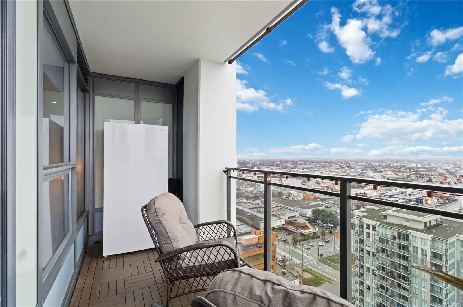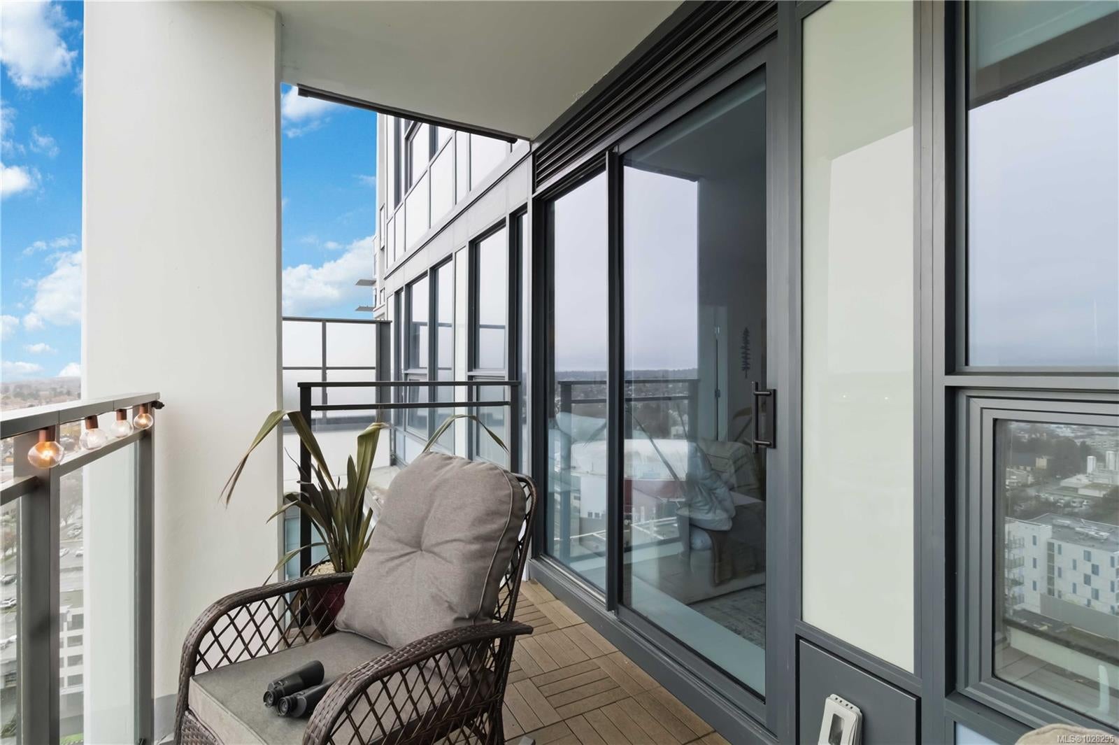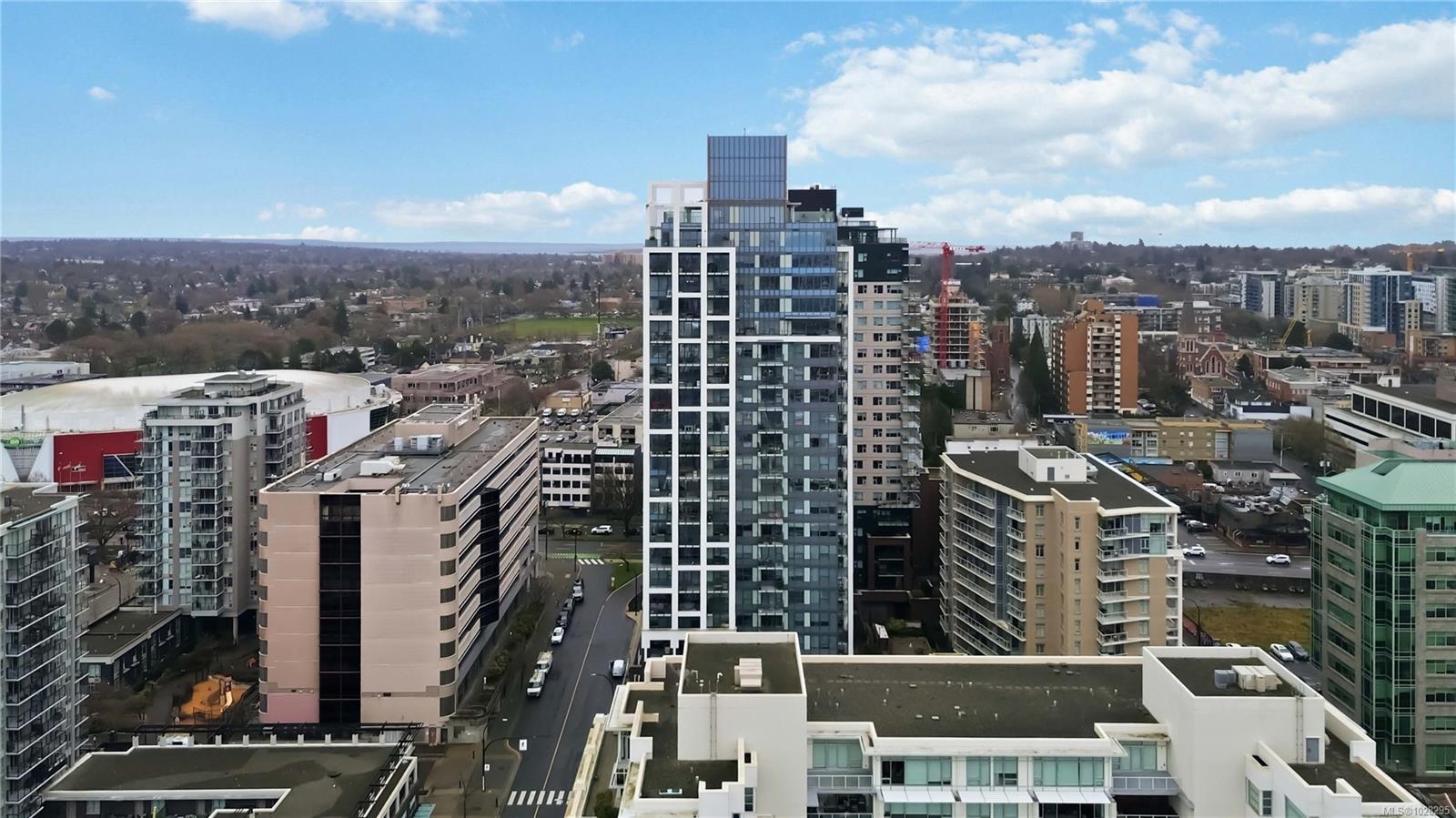 Welcome to the Executive 21st Floor at 777 Herald Street, where water, city, and mountain views create an exceptional downtown living experience. This executive two-bedroom, two-bathroom residence offers the rare bonus of two side-by-side secure underground parking stalls, a highly sought-after feature in the city. The thoughtfully designed open-concept layout is both stylish and functional, ideal for everyday living and entertaining. The modern kitchen features a spacious island with quartz countertops, built-in appliances, and sleek cabinetry, flowing seamlessly into the bright living room. Expansive floor-to-ceiling windows fill the home with natural light while showcasing the stunning surrounding views. This home includes several custom upgrades, including built-in closet organizers, a dedicated built-in desk/workspace, and stylish deck flooring that enhances the outdoor living area. Custom designed Restoration Hardware Cloud couch and matching linen chairs are available for purchase, offering a convenient turnkey opportunity. Residents enjoy access to an impressive range of amenities designed to complement urban living. These include a full time concierge, fully equipped fitness centre, yoga studio, sauna, business centre, hobby room, and a spacious resident lounge with a full kitchen, perfect for hosting gatherings. The landscaped outdoor terrace features BBQs, a large dining table, children’s play area, and cozy outdoor fire pits. A private guest suite is also available, providing comfortable accommodation for visiting family and friends. The location is unbeatable. With a grocery store just steps away and the vibrant downtown core at your doorstep, you are within easy walking distance to the Inner Harbour, cafés, restaurants, shops, and countless amenities that make downtown Victoria such a desirable place to live. This is executive downtown living at its finest, stunning views, thoughtful upgrades, outstanding amenities, and an unbeatable location.
