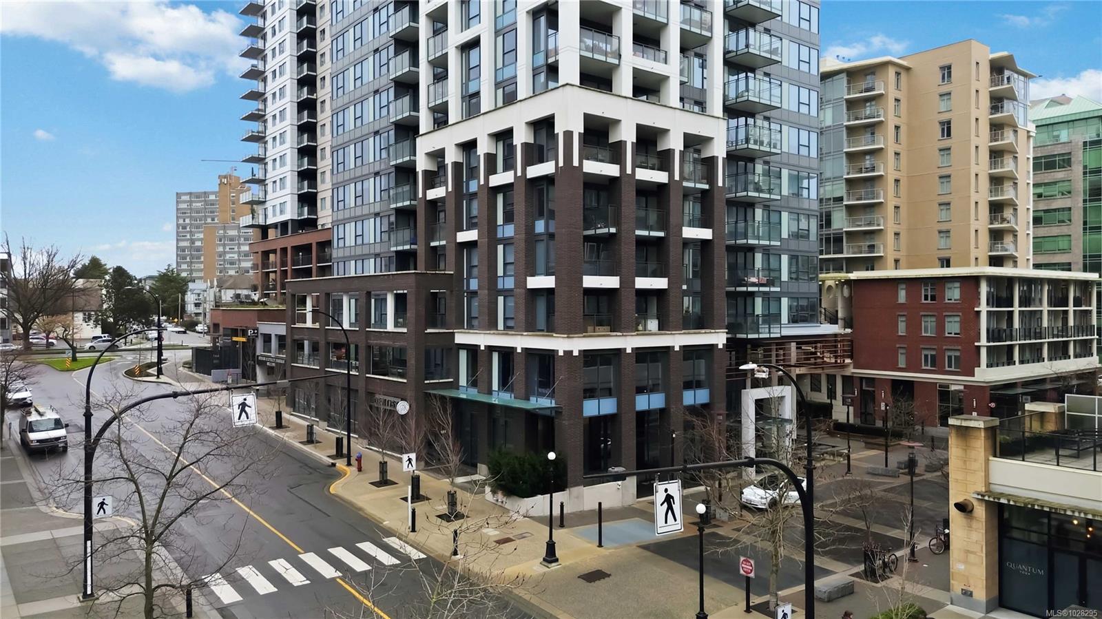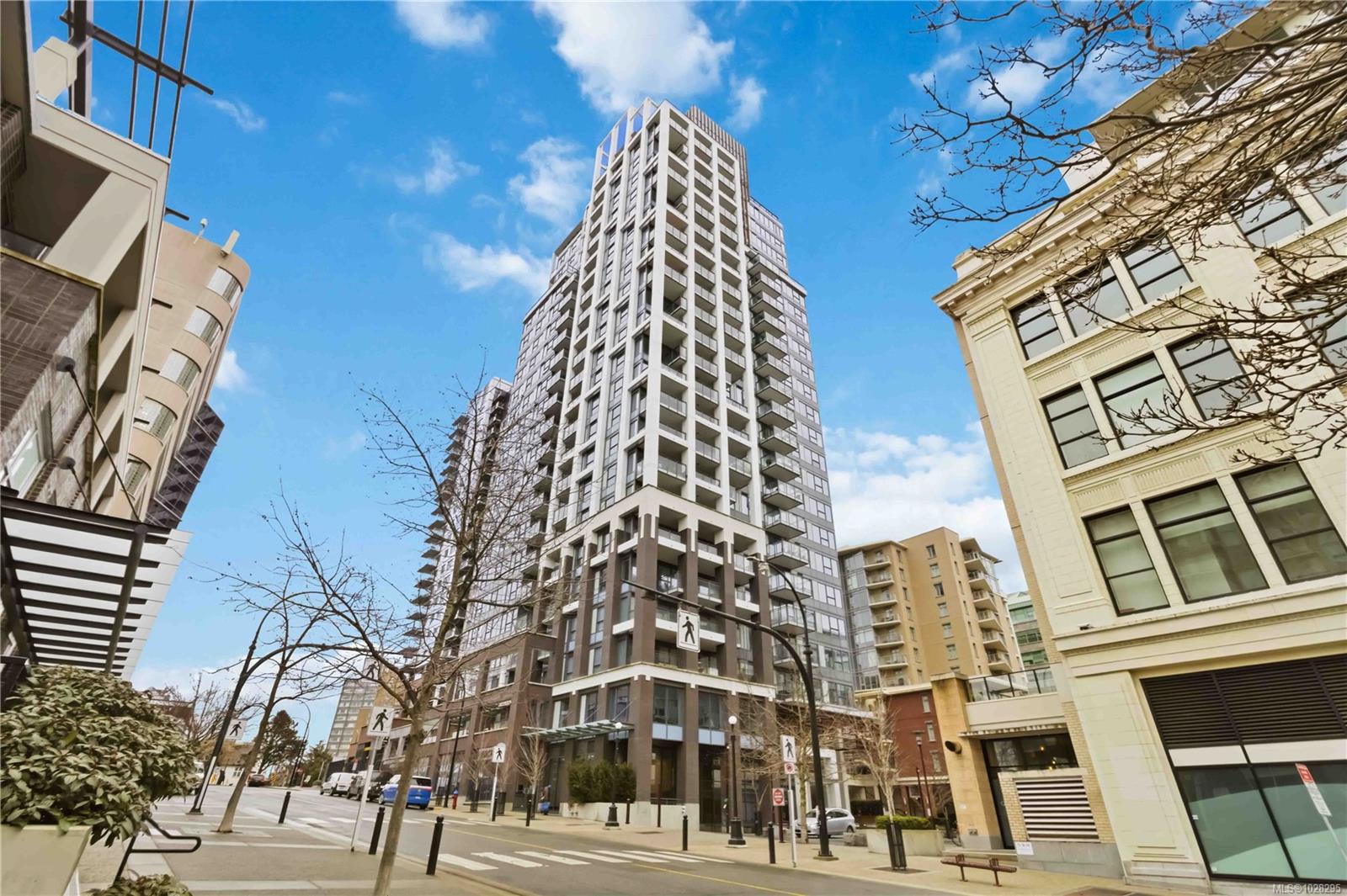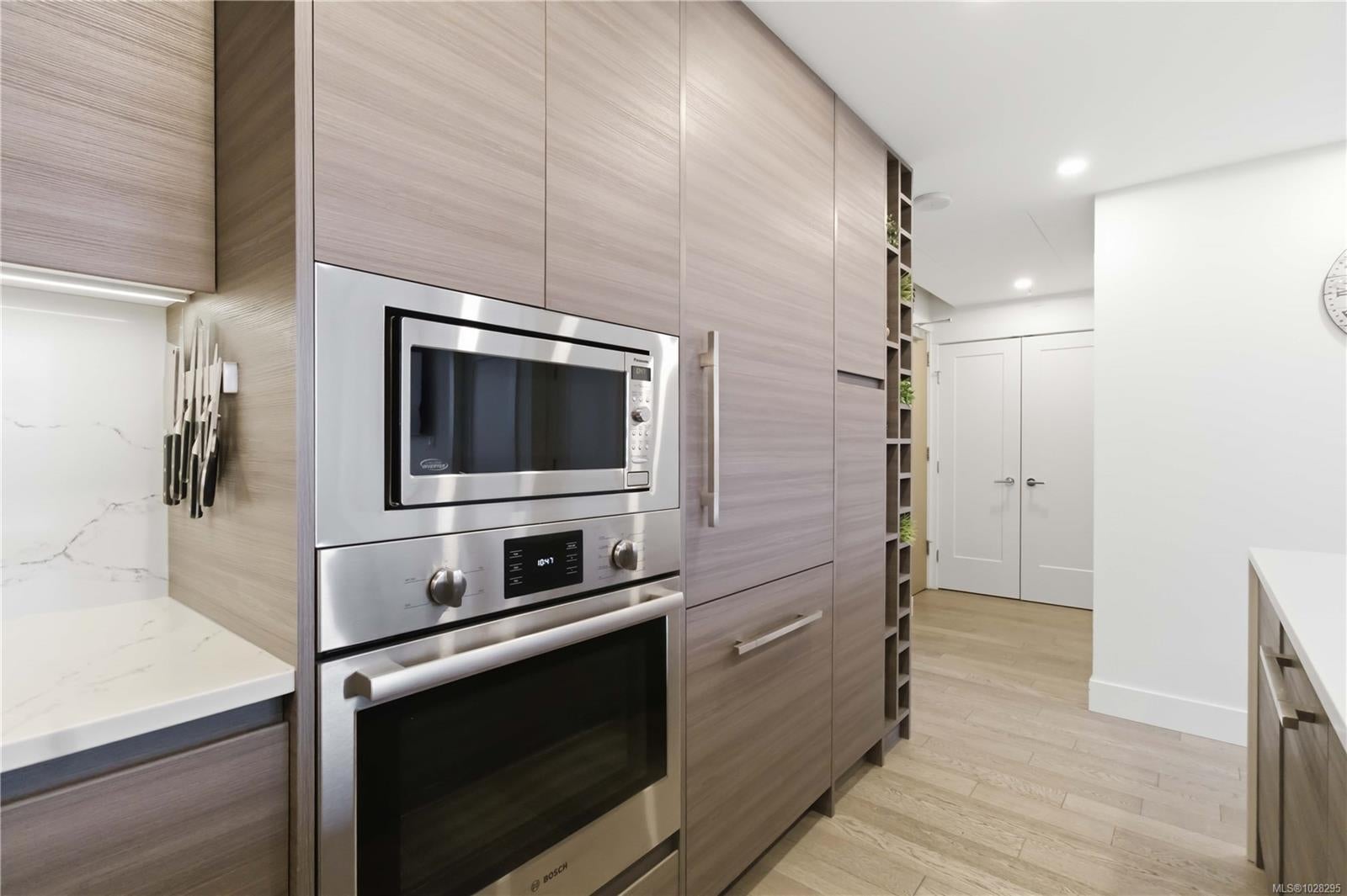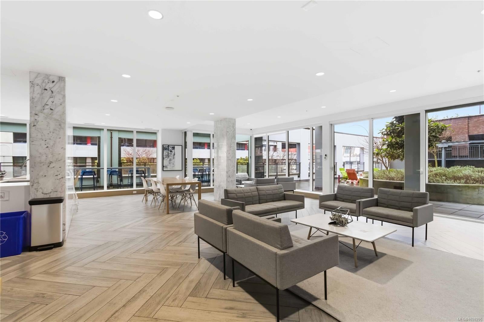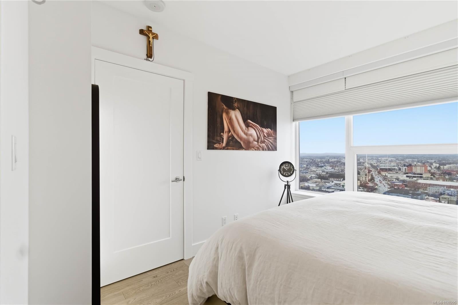 Welcome to the Executive 21st Floor at 777 Herald Street, where water, city, and mountain views create an exceptional downtown living experience. This executive two-bedroom, two-bathroom residence offers the rare bonus of two side-by-side secure underground parking stalls, a highly sought-after feature in the city. The thoughtfully designed open-concept layout is both stylish and functional, ideal for everyday living and entertaining. The modern kitchen features a spacious island with quartz countertops, built-in appliances, and sleek cabinetry, flowing seamlessly into the bright living room. Expansive floor-to-ceiling windows fill the home with natural light while showcasing the stunning surrounding views. This home includes several custom upgrades, including built-in closet organizers, a dedicated built-in desk/workspace, and stylish deck flooring that enhances the outdoor living area. Custom designed Restoration Hardware Cloud couch and matching linen chairs are available for purchase, offering a convenient turnkey opportunity. Residents enjoy access to an impressive range of amenities designed to complement urban living. These include a full time concierge, fully equipped fitness centre, yoga studio, sauna, business centre, hobby room, and a spacious resident lounge with a full kitchen, perfect for hosting gatherings. The landscaped outdoor terrace features BBQs, a large dining table, children’s play area, and cozy outdoor fire pits. A private guest suite is also available, providing comfortable accommodation for visiting family and friends. The location is unbeatable. With a grocery store just steps away and the vibrant downtown core at your doorstep, you are within easy walking distance to the Inner Harbour, cafés, restaurants, shops, and countless amenities that make downtown Victoria such a desirable place to live. This is executive downtown living at its finest, stunning views, thoughtful upgrades, outstanding amenities, and an unbeatable location.