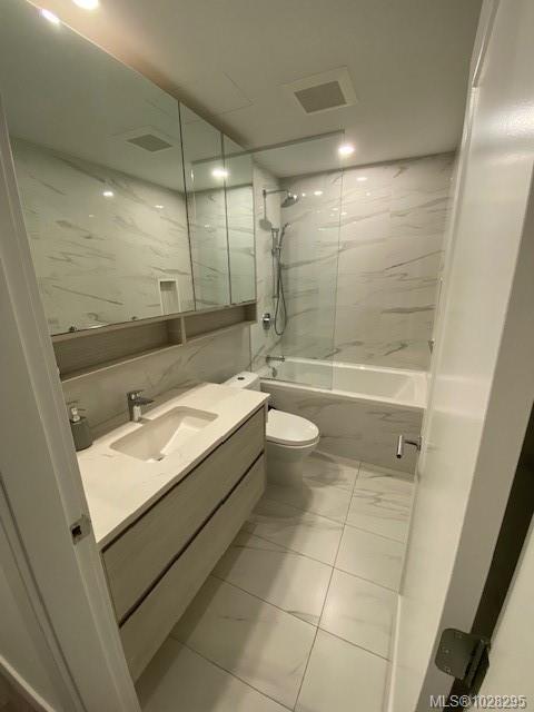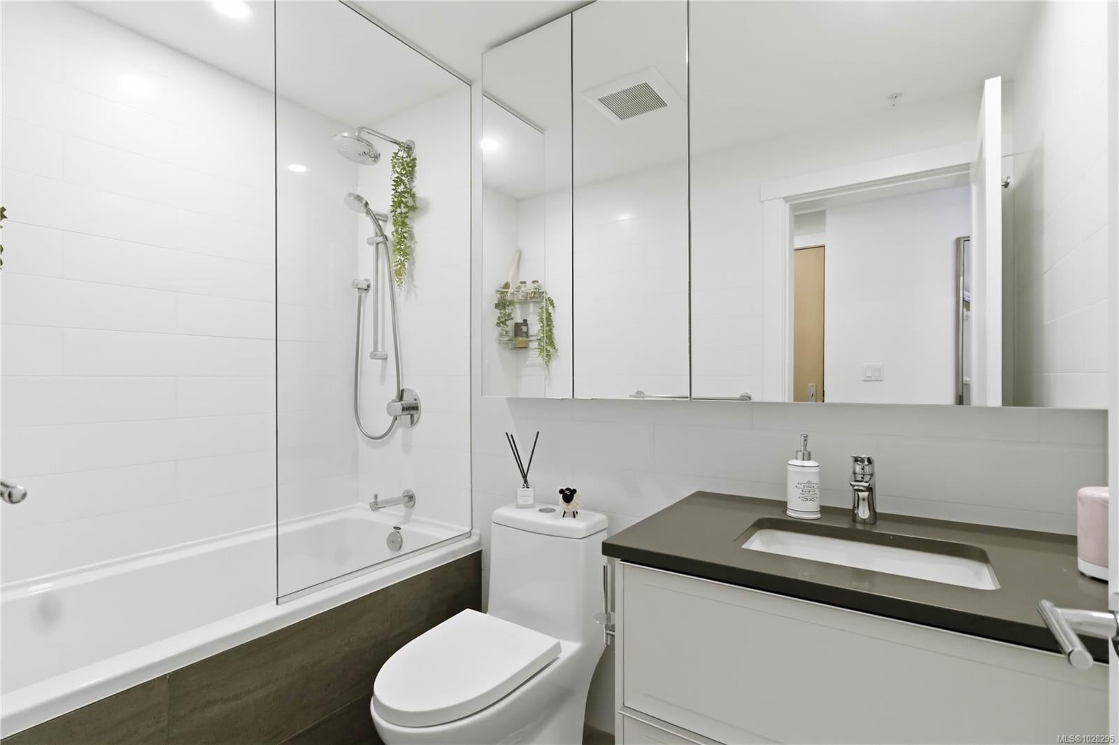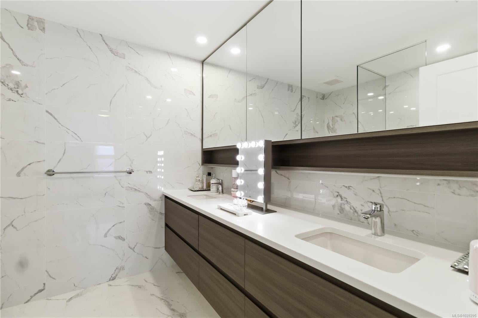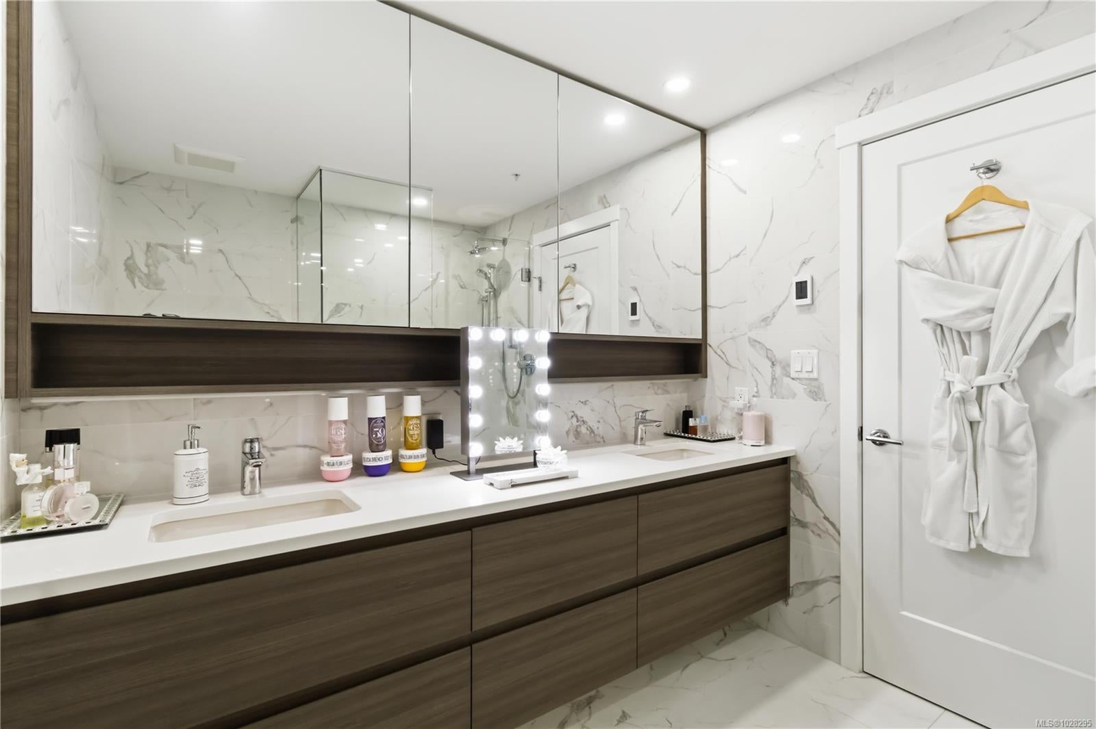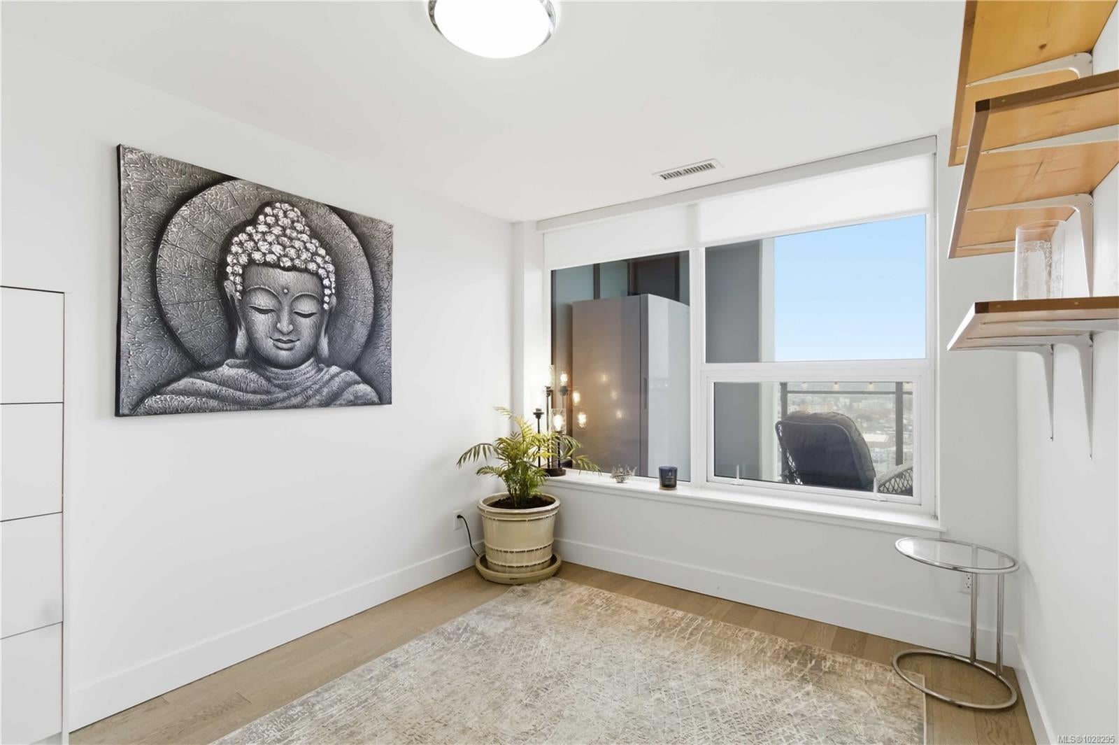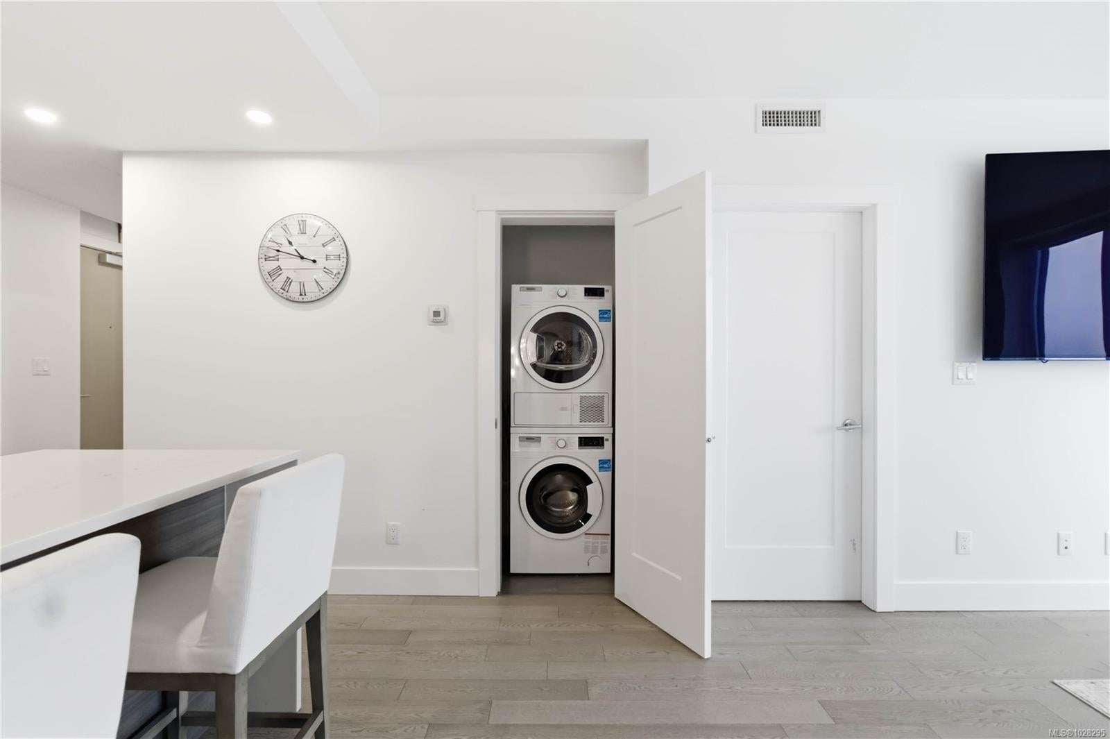 Welcome to the Executive 21st Floor at 777 Herald Street, where water, city, and mountain views create an exceptional downtown living experience. This executive two-bedroom, two-bathroom residence offers the rare bonus of two side-by-side secure underground parking stalls, a highly sought-after feature in the city. The thoughtfully designed open-concept layout is both stylish and functional, ideal for everyday living and entertaining. The modern kitchen features a spacious island with quartz countertops, built-in appliances, and sleek cabinetry, flowing seamlessly into the bright living room. Expansive floor-to-ceiling windows fill the home with natural light while showcasing the stunning surrounding views. This home includes several custom upgrades, including built-in closet organizers, a dedicated built-in desk/workspace, and stylish deck flooring that enhances the outdoor living area. Custom designed Restoration Hardware Cloud couch and matching linen chairs are available for purchase, offering a convenient turnkey opportunity. Residents enjoy access to an impressive range of amenities designed to complement urban living. These include a full time concierge, fully equipped fitness centre, yoga studio, sauna, business centre, hobby room, and a spacious resident lounge with a full kitchen, perfect for hosting gatherings. The landscaped outdoor terrace features BBQs, a large dining table, children’s play area, and cozy outdoor fire pits. A private guest suite is also available, providing comfortable accommodation for visiting family and friends. The location is unbeatable. With a grocery store just steps away and the vibrant downtown core at your doorstep, you are within easy walking distance to the Inner Harbour, cafés, restaurants, shops, and countless amenities that make downtown Victoria such a desirable place to live. This is executive downtown living at its finest, stunning views, thoughtful upgrades, outstanding amenities, and an unbeatable location.